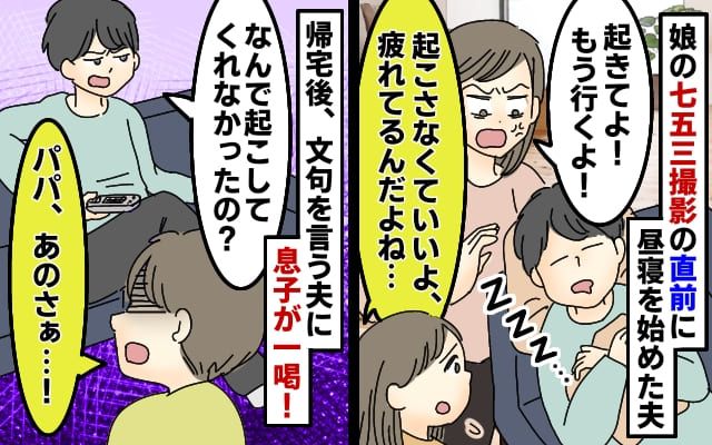 娘の七五三撮影前に昼寝する夫。「なんで起こしてくれなかったの?」悪びれない夫に10歳の息子が喝!