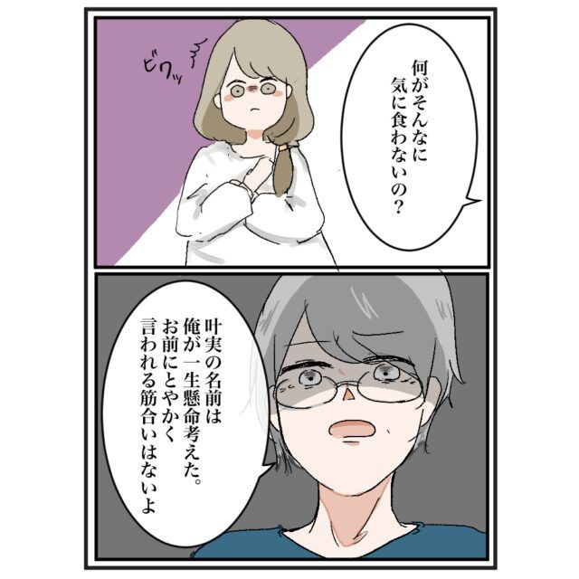 「何がそんなに気に食わないの?」尖った口調にゆうかさんは驚きました。「叶実の名前は、俺が一生懸命考えた。お前にとやかく言われる筋合いはないよ」ご主人が冷たく言いました。