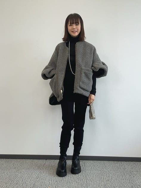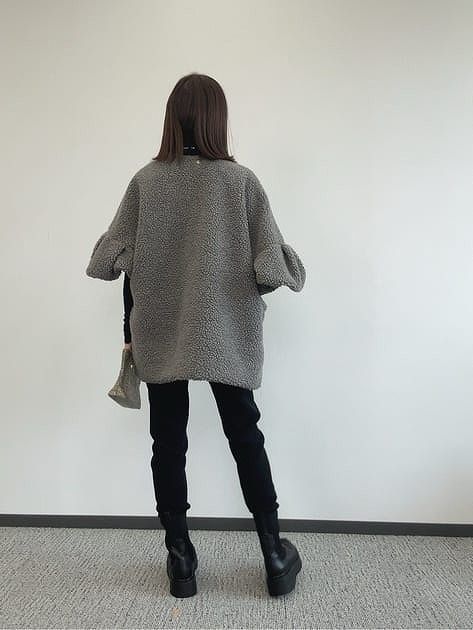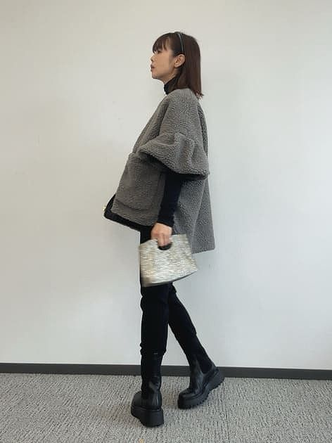 袖のフリルやデザインがトレンドのボア素材を使用。落ち着いたグレーカラーが女性らしさを演出します。後ろ下りのAラインがお尻を隠しつつ前はスッキリと見せてくれるのでスタイルアップ効果も◎。オールブラックでもフリル付きのボアポンチョで程よい甘コーデに。