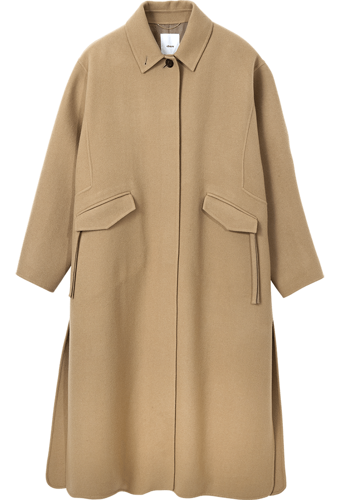 ラムウールを丁寧にメルトン仕上げし、カシミアライクな光沢となめらかさが堪能できるロングコート。ドルマンスリーブのような袖のカッティングで、インナーに厚手のニットも着用しやすい。裏地なしの一枚仕立て。