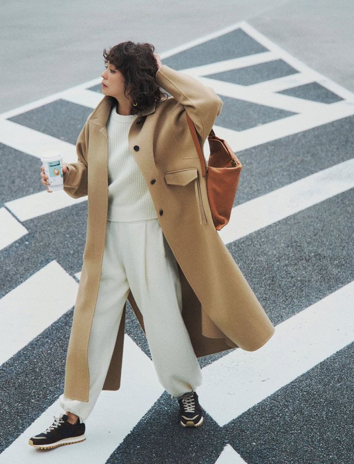 コート¥121,000(エブール/リトルリーグ インク)、ニット¥46,200、ニットパンツ¥61,600(共にエイトン/エイトン 青山店)、ピアス¥62,700(コール ムーン/ショールーム セッション)、バッグ¥46,200(プンティ/エルディスト)、スニーカー¥26,950(ノヴェスタ/ドレステリア 渋谷スクランブルスクエア店)