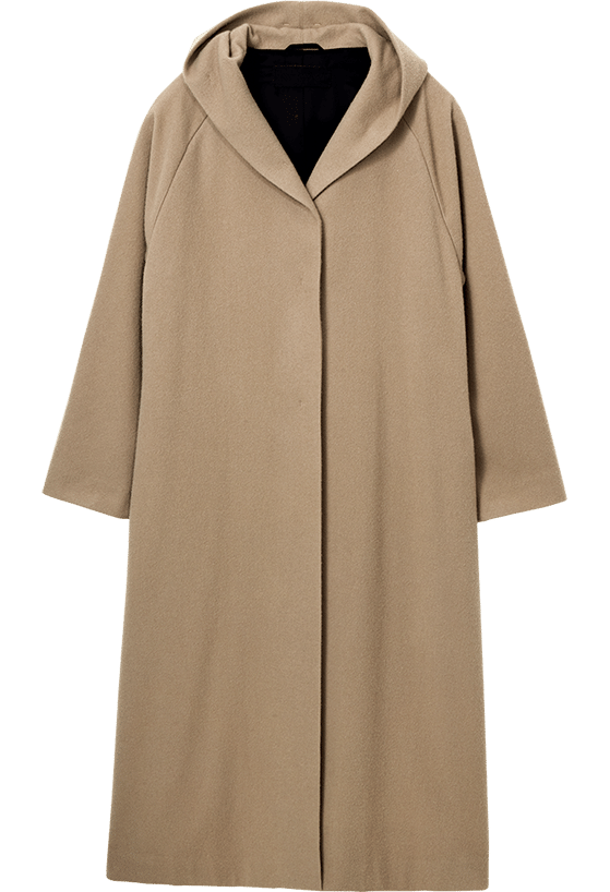 柔らかなカーキ色が顔色を明るく見せてくれ、フード付きのラフさが魅力の一着。ストンとしたAラインがキレイ。