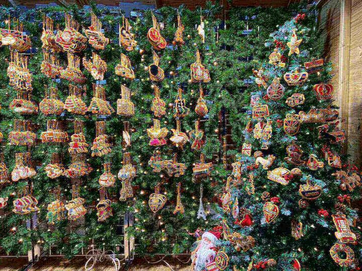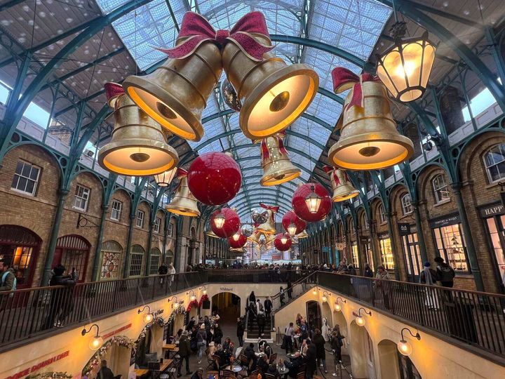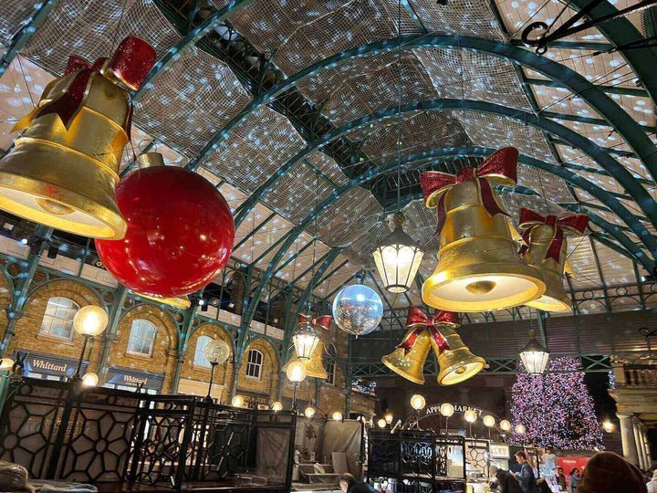 そんなコベントガーデンでは、11月〜12月にかけて、クリスマスシーズン限定の可愛らしい装飾を楽しむことができます。リボン付きの巨大なベルや飾り玉、回転するミラーボールなど、思わず写真に収めたくなる華やかさ。