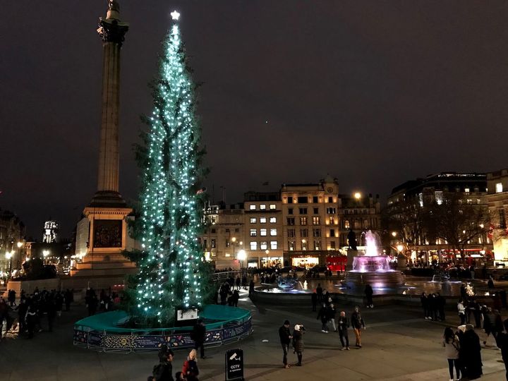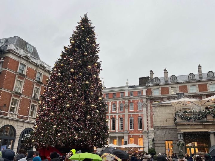コベントガーデンの広場には、巨大なクリスマスツリーも出現します。約18メートルにも及ぶクリスマスツリーは3万個以上ものライトで飾られ、存在感のあるリボンでラッピングされているのが特徴で、毎年訪れる数千人もの人々を魅了します。