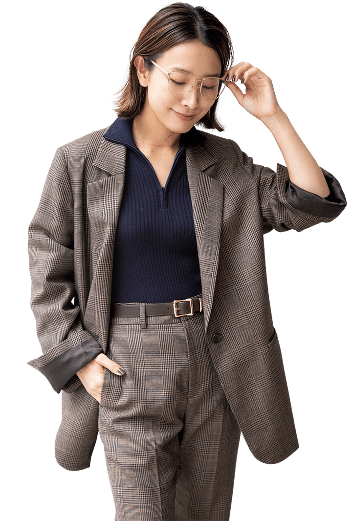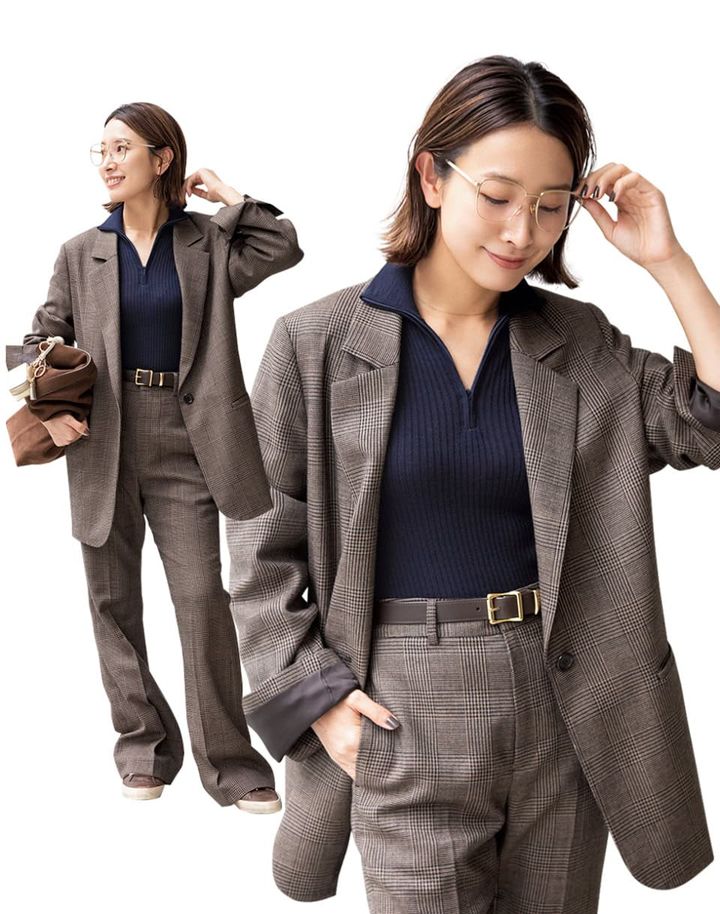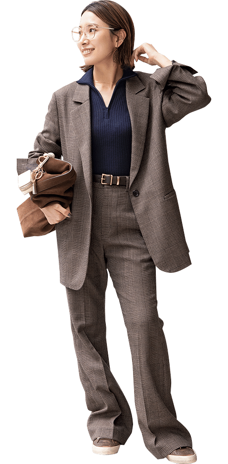 「グレンチェックのセットアップは今季気になるブラウントーン。オーバーサイズのジャケットと、セミフレアのすっきりとしたパンツはセットアップで着てもコンサバ過ぎないのが◎」