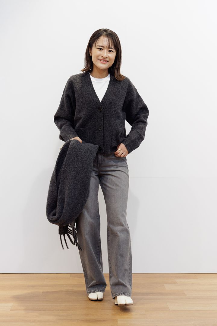 ワイドストレートジーンズ¥3,990 スフレヤーンVネックショートカーディガン¥2,990 スフレヤーンチャンキーストール¥2,990(すべてユニクロ)その他・私物