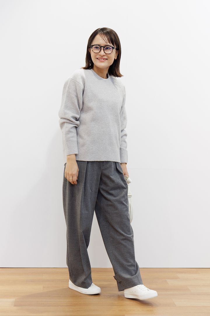 「グレーだけでも地味にならないコツは、同系色の濃淡や素材違いを重ねてコーディネートに奥行きをつくること。青みのあるライトグレーが新鮮な印象のスフレヤーンクルーネックセーターに、JW ANDERSONコラボの2WAYタックストレートパンツを合わせて。こちらのパンツは裾タブ付きなので、好みに合わせてストレートにもテーパードにも変幻自在。パンツをテーパードに絞って、ヒール合わせも◎」