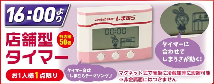 セール初日には、ノベルティがプレゼントされるキャンペーン「タイムジャックノベルティ」も実施されます。10時00からは「店舗型充電器」が、16時00からは「店舗型タイマー」が用意されていますよ。なお、プレゼントには数に限りがあり、どちらも「しまむらアプリ会員証」を提示の上、税込5,000円以上お買い上げのお客様かつ先着に限ります。