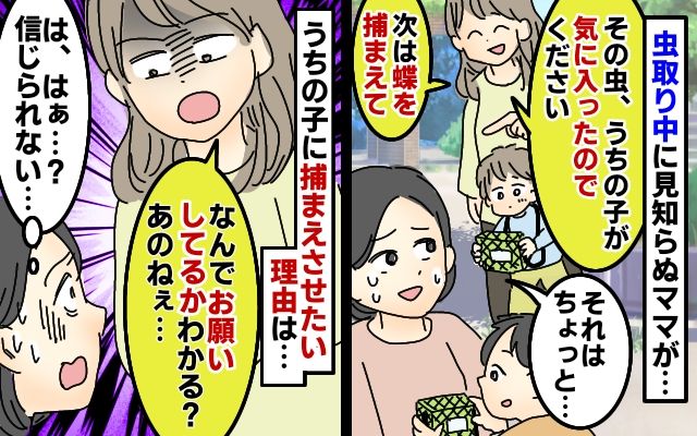 3. 公園で息子と秋の虫取り中、見知らぬママが「捕まえた虫ちょうだい。次は蝶を捕って」要求の理由に驚愕