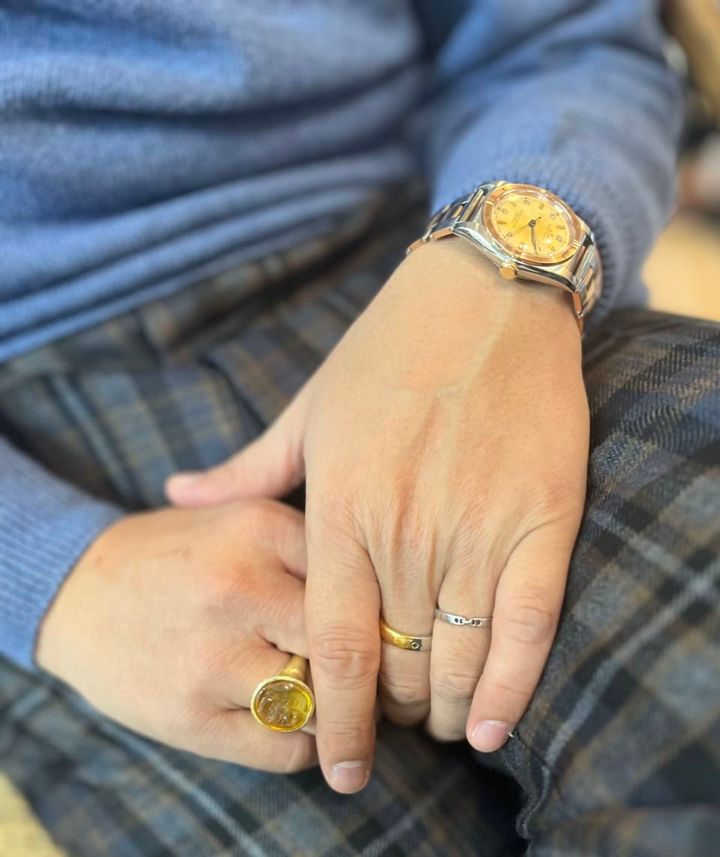 絶大な存在感を放つリングは、2000年前のトパーズで300年前に作られたインタリオリング。時計はロレックス、左の中指のリングはマルコムベッツ、薬指のリングはエルメス