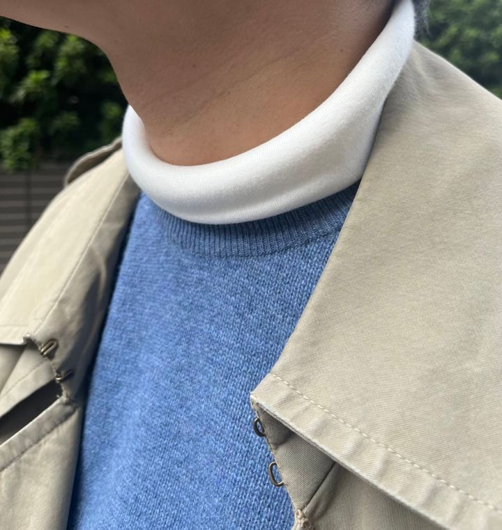 ブリティッシュからアメカジまで、ファッションの守備範囲はかなり広めだという尾崎さん。今回ピックした【サンカッケー】の別注ニットは、スコットランド人から見るヴィンテージデニムを表現した色が魅力。「ちょっと野暮ったいイメージがあるニットなので、シャツをインするとトラッドになりすぎてしまう。なので、さっぱりとした雰囲気をプラスできる白のタートルネックカットソーをインナーに選び、そのイメージを払拭させました」