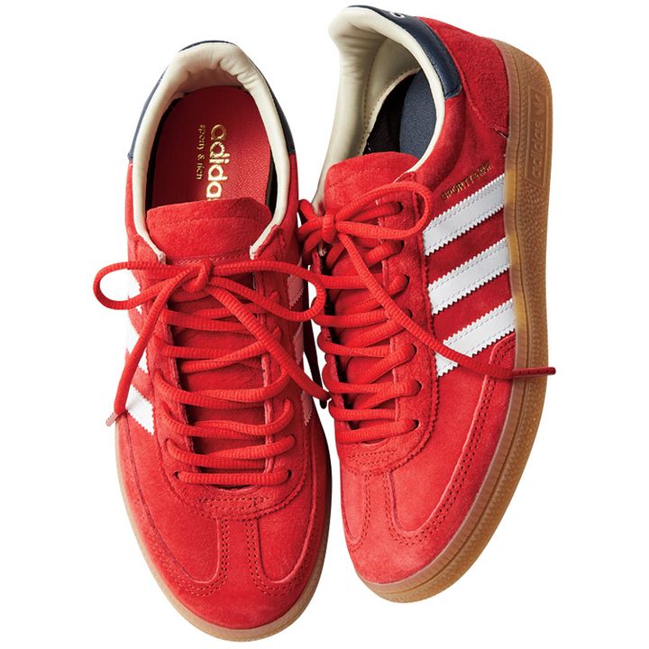 「NKNITのヘンリーネックは顔映りも華やかなトレンドの赤を。adidasスニーカーは差し色の赤&ピンクが大活躍します」