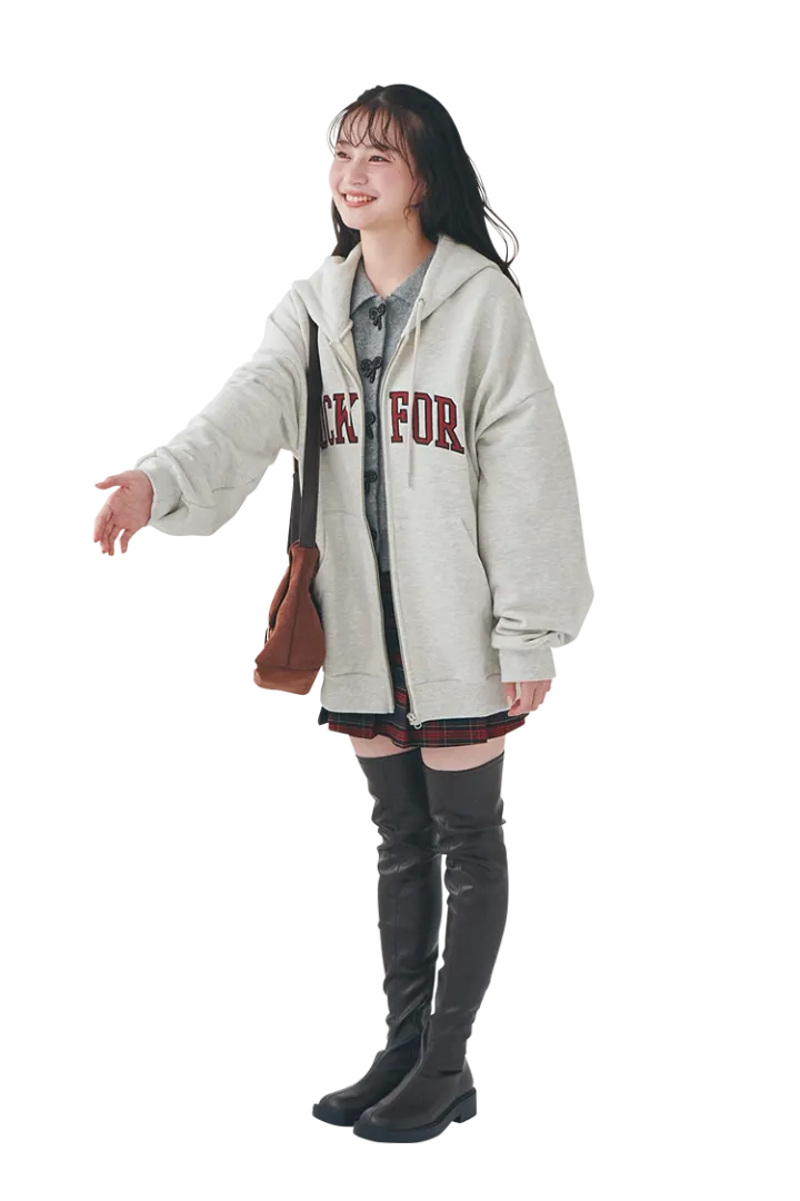 ガーリーなアイテムもラフなパーカをあわせたら甘くなりすぎない。トップスとミニスカがパーカにすっぽり収まるのが可愛い♡