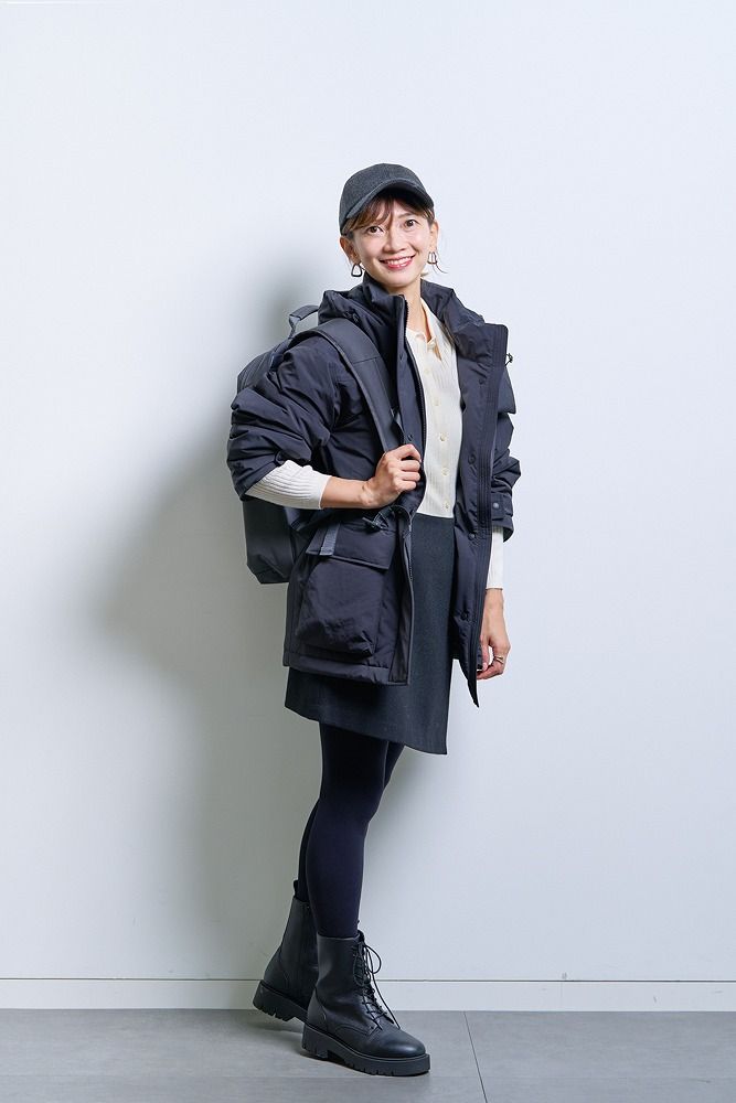 ハイブリッドダウンコート¥12,900 メリノリブポロカーディガン¥3,990 ツイードスコート¥2,990 ヒートテックタイツ¥1,500 ファンクショナルバックパック¥4,990 UVカットキャップウールブレンド¥1,990(すべてユニクロ)ブーツ(参考商品)アクセサリー(私物)※すべてМサイズ着用