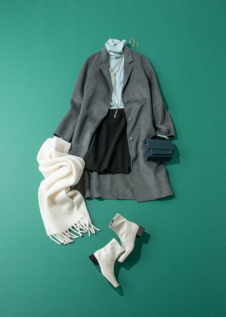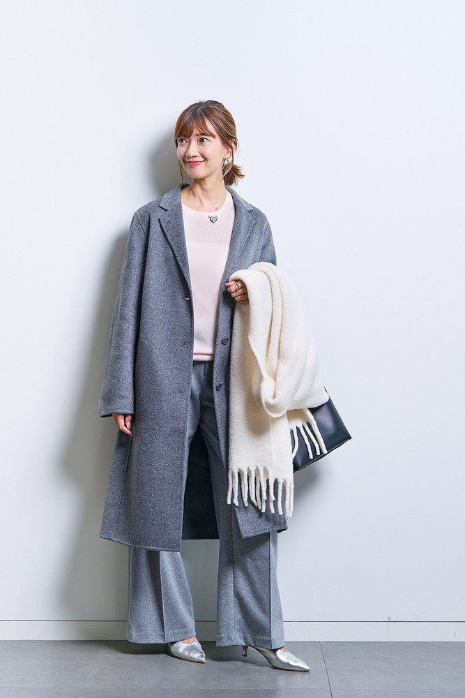 ダブルフェイスチェスターコート¥9,990 カシミヤクルーネックセーター¥9,990 ブラッシュドジャージーワイドパンツ¥3,990 スフレヤーンチャンキーストール¥2,990 レザータッチスクエアショルダーバッグ¥2,990(すべてユニクロ)靴、アクセサリー(ともに私物)