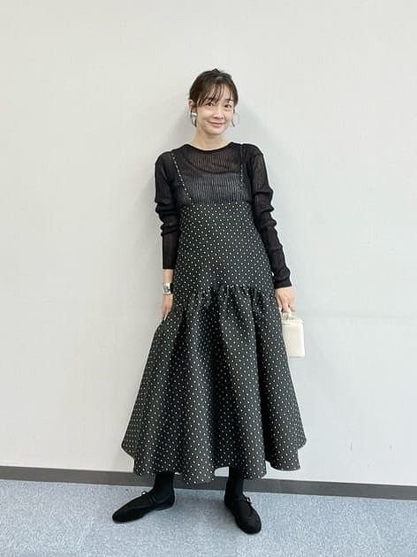 胸下くらいまで上げてキャミワンピ風コーデに。インナーを強調したブラックスタイルです。華奢なストラップとふわっと広がるスカートが全体を華やかに仕上げます。長さを調整できるアジャスターつきなのも嬉しいポイントです。