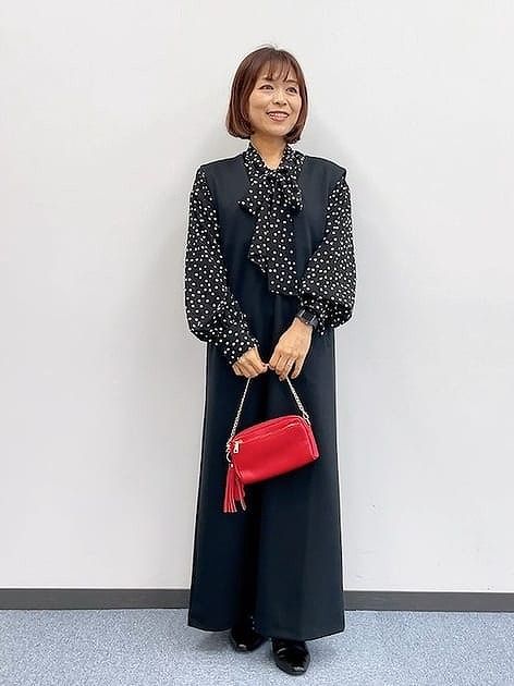 長めの丈感でストンとしたシルエット。体のラインを拾わないので体型をスッキリ見せてくれるデザインです。これ1枚でオンオフどちらの場面でも使える着回し力抜群のアイテム。きちんと感が欲しい日はボウタイブラウスを合わせて気品漂うスタイルがぴったり。