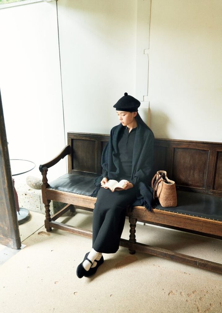 益子を訪れるなら『スターネット』は欠かせない。ショップとギャラリー、カフェが一体となった空間で、手仕事の道具や衣服、食材などを扱いながら、作家の個展やコンサートも開催している。この土地の文化が集うシックな場所に着て出かけたのは、〈コモリ〉のニットポロドレス。ウールを縮絨加工したフェルトのような生地は優美な質感で、シルエットもタイトだから、一枚でぐっと気品のある装いに。ドレス¥85,800、ストール¥63,800(ともにコモリ/ワグ インク 03‒5791‒1501) 帽子¥19,800(マーガレット・ハウエル 03‒57 85‒6445) バッグ¥930,600(WMV/ダブリュー エム ブイ ビズビム トウキョウ 03‒6303‒3717) その他スタイリスト私物