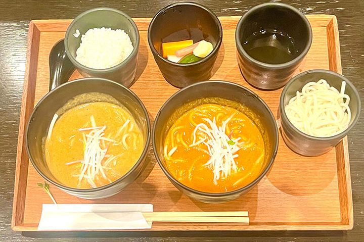 トマトカレーはやはり酸味が利いているけれど、全体的にマイルドな味わい。出汁の旨味を感じつつ、稲庭風細目のうどんが、よくカレーに絡んで食べやすい。交互に食べて、添えられているご飯をカレーに沈めつつ二度美味しい、いや二種なので三度、いやそれぞれが二度だから四度美味しいのか。箸休めのピクルスも食べやすく健康的ななお味だ。