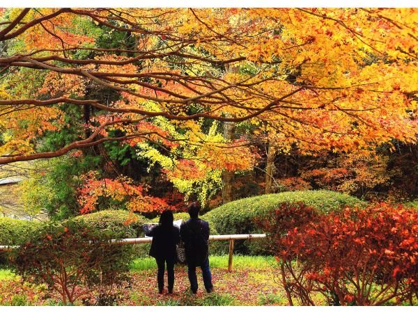 四季折々の植物を見ることができる公園には、樹齢80年ほどの大きなイロハモミジが800本! 入口付近から山頂まで徐々に色づいていきます。ナンテンなどの木の実や、サルスベリ・ドウダンツツジ・イチョウなど多彩な木々の紅葉も楽しめます。鳥の声を聞きながら、日常を少し忘れて自然を感じてみて。無料で使用できる休憩室もあり。