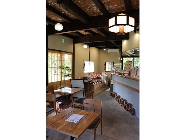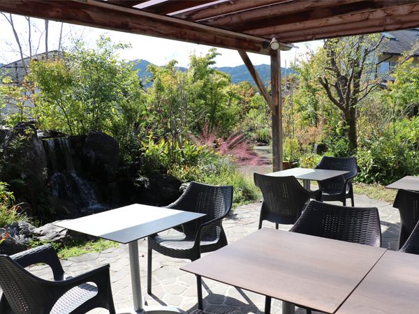 もともとは造園・庭づくりの会社で、植物を買いに来る人たちがゆっくり休憩できるスペースを作りたいという思いから始まったのだそう。かやぶき屋根の店内は落ち着いた空間が広がり、テラス席へと続く大きな窓からはやわらかい光が降り注ぎます。外へ出ると、滝の音が心地良く流れる自然に包まれます。庭を散策するのもおすすめ。