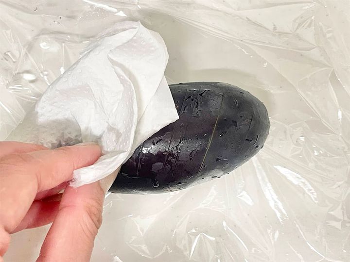 ラップを敷いて、サラダ油をキッチンペーパーに染み込ませ、なす全体に塗ったらラップに包みます。