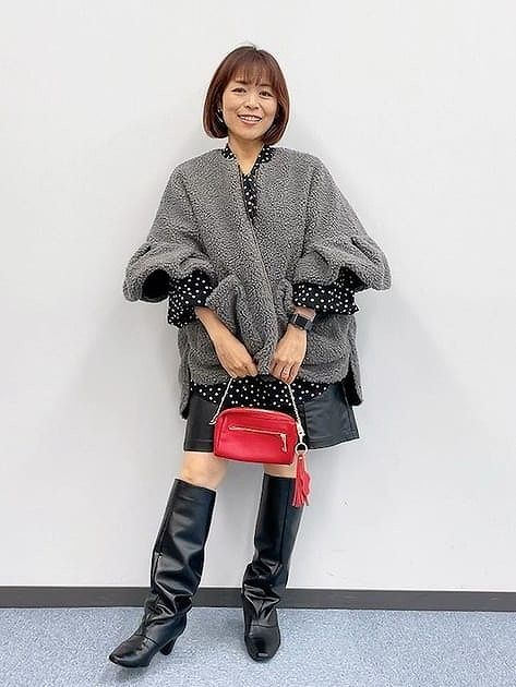 トレンド感高めのデザインが可愛いボアポンチョを主役にコーディネート。控えめフリルとインナーのドットブラウスで大人の甘さを演出しつつ、レザー素材で甘辛スタイルに仕上げました。こちらのポンチョの裏面はキルティング素材のリバーシブル使用。気分で着方を変えられるのも楽しいポイントです。