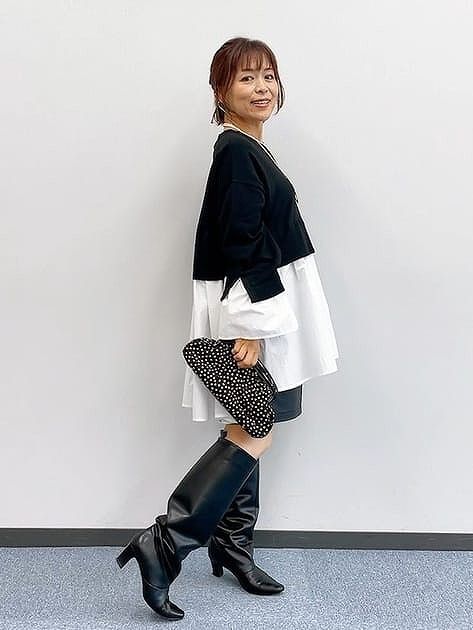 ひらひらとボリューム感あるシャツ生地とレザーのロングブーツで大人っぽく華やかな印象に。流れるようにキレイなサイドラインとお尻周りをしっかりカバーしてくれるシルエットが魅力的。このトップスだけで簡単にレイヤードスタイルが楽しめます。レイヤードは難しそう…と思ってる方も気軽に挑戦できるコーデです。