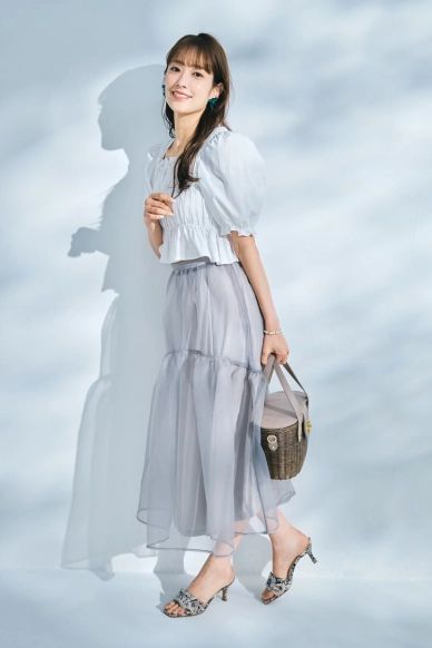 清楚な雰囲気の万人ウケコーデ。カゴバッグやミュールで夏ムードを高めて。ふんわりとした、軽やかなシルエットがやわらかい印象を演出してくれる♡