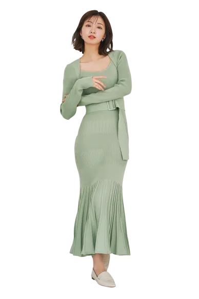 タイトなシルエットとマーメイドラインが女性らしさを演出してくれるニットワンピ。ボレロをあわせたようなドッキングデザインなら、簡単に上級者感のあるコーデに仕上がる! 爽やかなミントグリーンと白のローファーで品よく仕上げて。