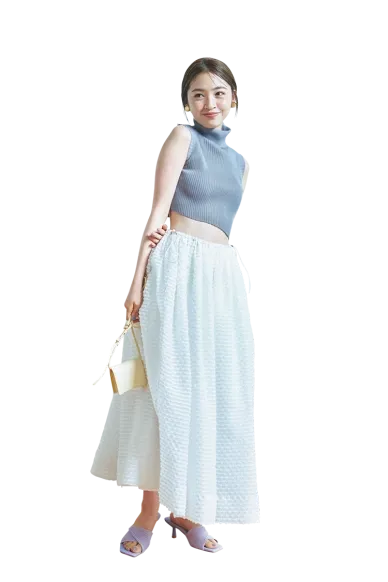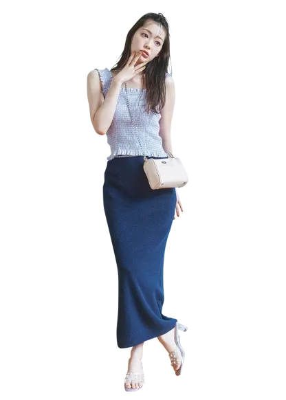 タイトなシルエットの女性らしいコーデ。露出度の低いロングスカートをあわせることで、バランスの取れた肌見せが叶う!白やクリア素材の小物をあわせると涼しげな印象に仕上がります♡