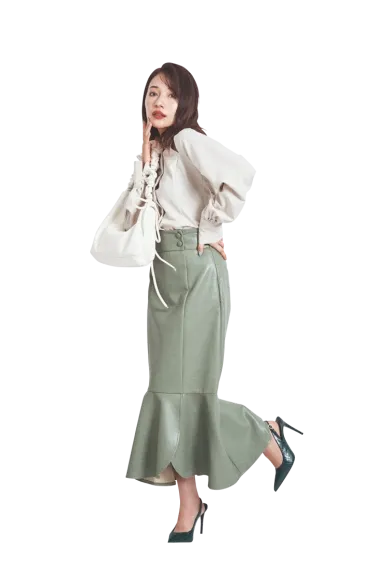 ブラウスのゆるっと感とスカートのピタッと感でメリハリを意識。レザースカートが高見えを叶えてくれる!グリーンのアイテムを選んで知的な印象に♡