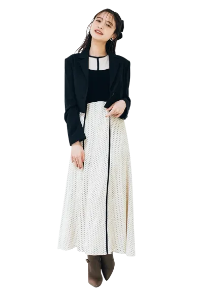 かっちり見えするモノトーンワンピが主役のコーデ。ドット柄で甘さもプラスして!かっちりとしたショート丈のジャケットをあわせることで、きちんと感のある着こなしに仕上がります。