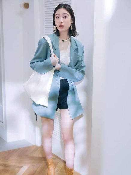 爽やかで春らしいライトブルージャケットを使ったコーデ。インナーのシアートップスが抜け感を演出。ショーパンから足見せすることで女のコらしい雰囲気に仕上がります♡