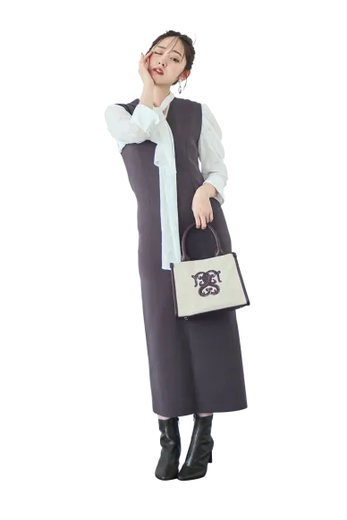 Iラインのジャンスカで縦のラインを強調♡ クラシカルなボウタイブラウスが上品な雰囲気を演出してくれます。ロゴバッグをコーデのアクセントにして。