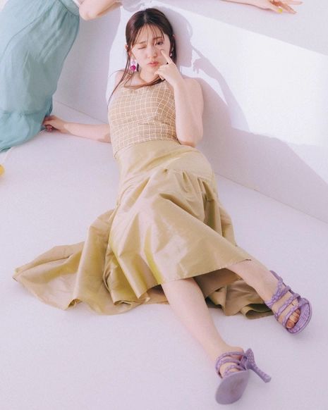 ツヤ感たっぷりで高見えするマキシ丈スカートが主役のコーデ。腰回りのラインが強調されるスカートで色っぽく仕上げて♡ イエローのビスチェとあわせてワントーンコーデに。差し色にパープルのサンダルを選んで!