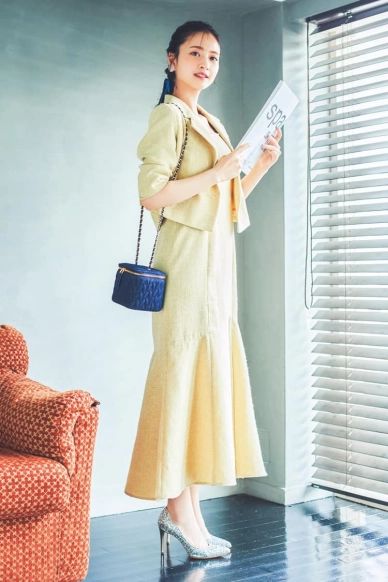 凛としたツイードワンピが主役のコーデ。ラメが夏の日差しに映える◎。Vネックでデコルテをキレイに魅せて華奢見えを狙って!