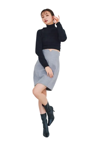 黒ニット×グレーミニスカのモノトーンコーデ。黒を基調にすることでコーデが大人っぽくシックな印象に仕上がります。肌見せが叶うショート丈トップスにはハイウエストのミニスカをあわせることで脚長効果を狙って♡
