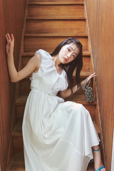 ふんわりとしたタックやギャザーが効いたワンピが、女性らしいやわらかな雰囲気を演出してくれる♡ 存在感のあるパールバッグがコーデのアクセントに。差し色にはブルーのサンダルをあわせて!