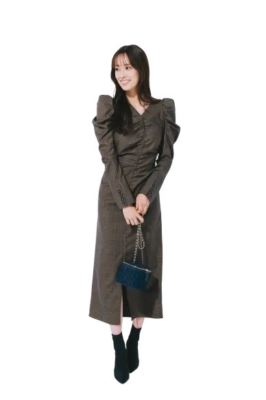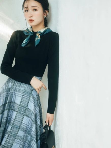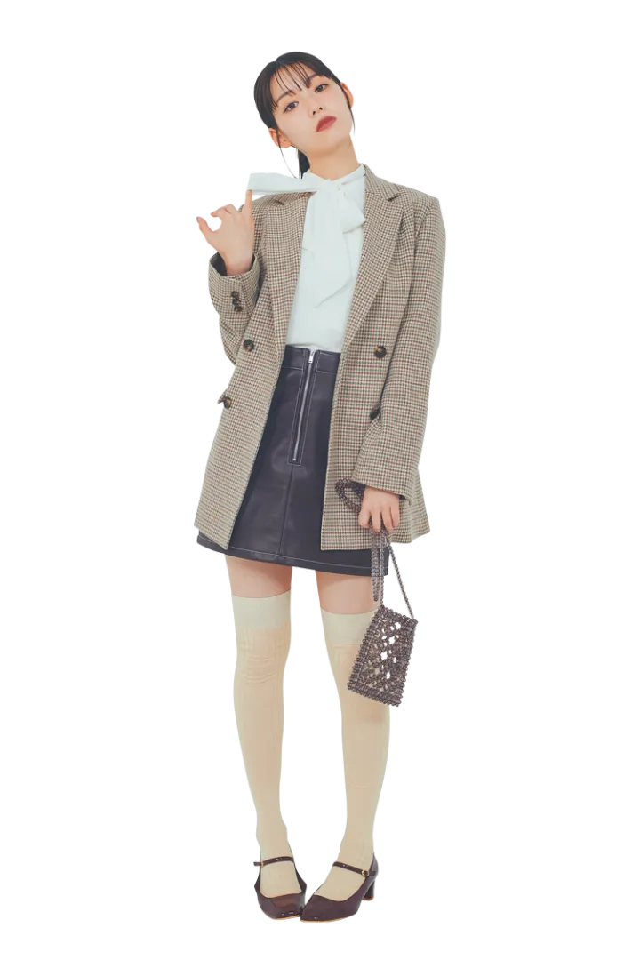 チェック柄やブラウンなど秋らしさ満載のコーデ。ジャケットやボウタイブラウスがコーデをきれい目な印象に。スカートのセンタージップでIラインをメイク!