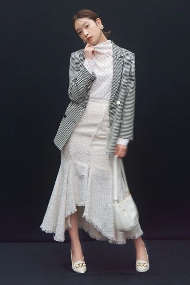 マーメイドスカートにジャケットをあわせた大人っぽいコーデ。着こなしが難しい柄×柄も、オールホワイトでまとめることでおしゃれにまとまる!透け感のあるトップスには重厚感のあるツイードスカートをあわせてメリハリのあるコーデに仕上げて♡