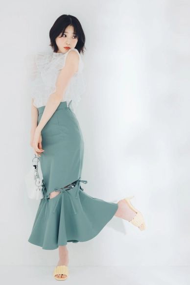 ブラウス×マーメイドスカートのコーデ。スリットから大胆に広がるマーメイドラインが女性らしさを演出。狙っている感のない肌見せで抜け感のあるコーデに♡ 小物は淡い色みのアイテムで統一して!