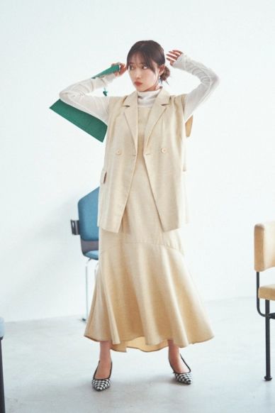 ジレとキャミワンピのセットアップコーデ。マーメイドワンピがコーデをフェミニンな印象に♡ 体のラインを隠してくれるジレで直線的なシルエットを演出!グリーンのバッグを差し色にして。