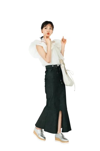 カジュアルになりがちなデニムスカートも、マーメイドラインでフェミニンな雰囲気に。透け感のあるリボンブラウスで顔まわりを華やかに盛って♡ 足元はシルバーシューズをあわせてコーデのアクセントに!