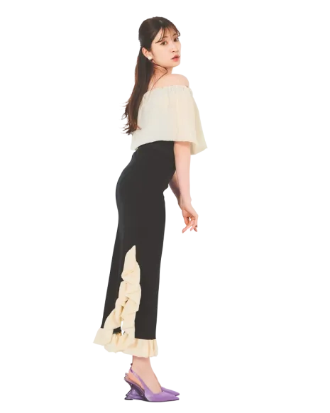 大ぶりなフリルが印象的なコーデ。オフショルトップスで大胆に肩見せ♡ 二の腕は隠してくれるから、華奢見えが叶います。タイトなスカートをあわせて女性らしく仕上げて!