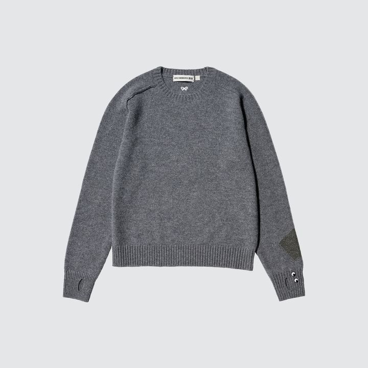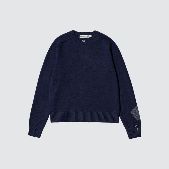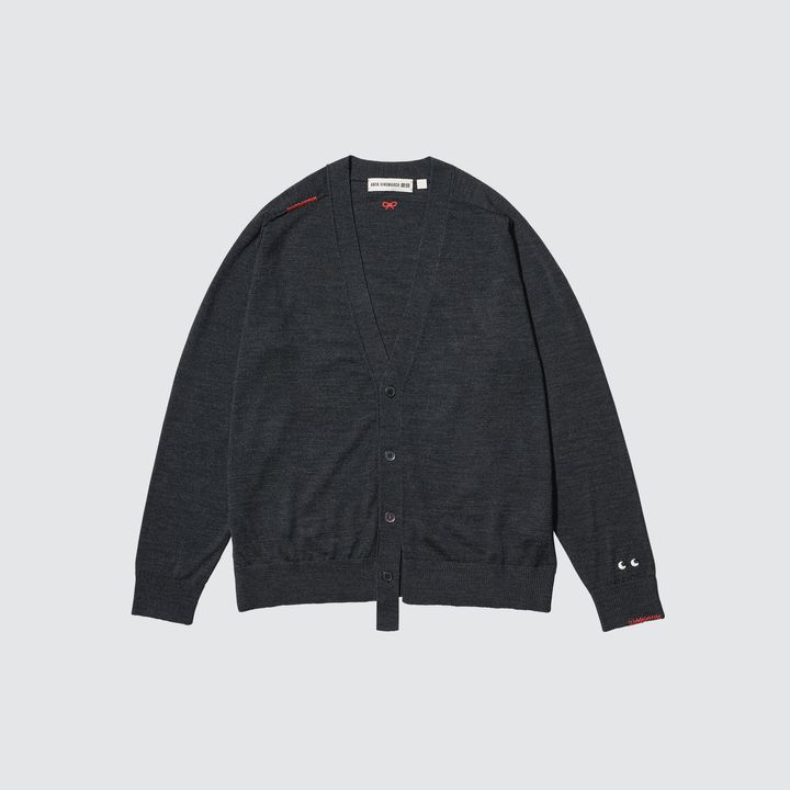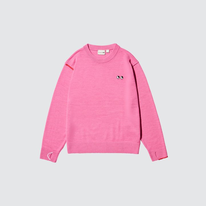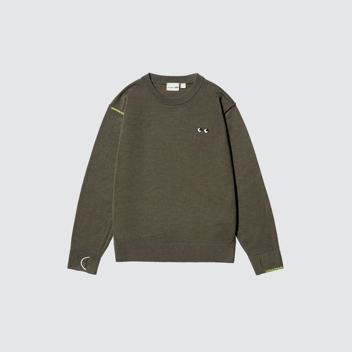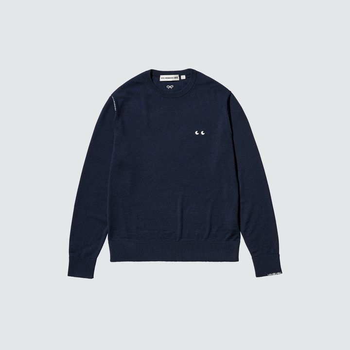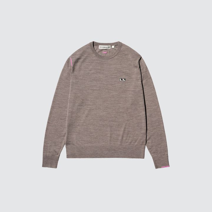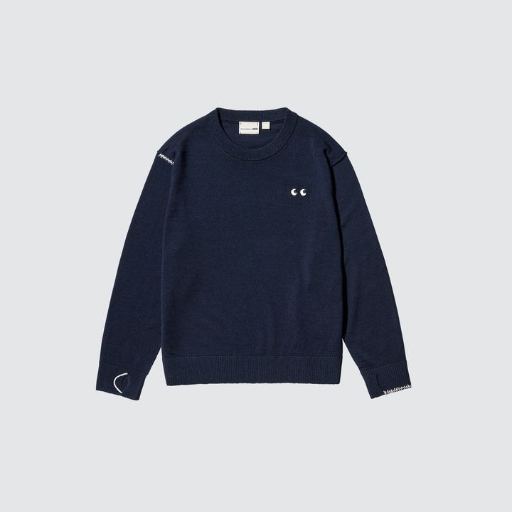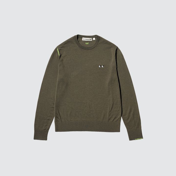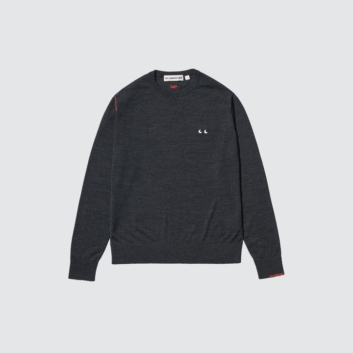 普段のコーデにもなじむシンプルさで使いやすいと評判だったニットも再びラインナップ。メリノセーターと、カシミヤセーターの2種が揃います。メリノセーターは使いやすいダークグレイ、オリーブ、ネイビー、ブラウンの4色展開。袖口やアームホールのアクセントステッチがアクセントに。カシミヤセーターは袖口に「EYES」の刺繍が施され、ちょうどサムホールが口のように見えるチャーミングなデザイン。定番のネイビー等に加え、赤やピンクの明るめカラーもおすすめです。メリノウールクルーネックセーター¥3,990 カシミヤニットクルーネックセーター¥12,900(すべてユニクロ×アニヤ ハインドマーチ)