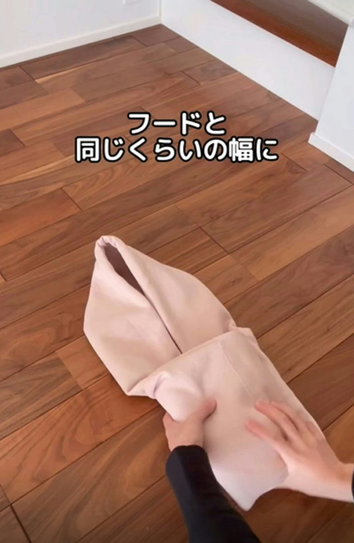 そして、フードと同じくらいの幅になるように折りたたみ、ひっくり返します。