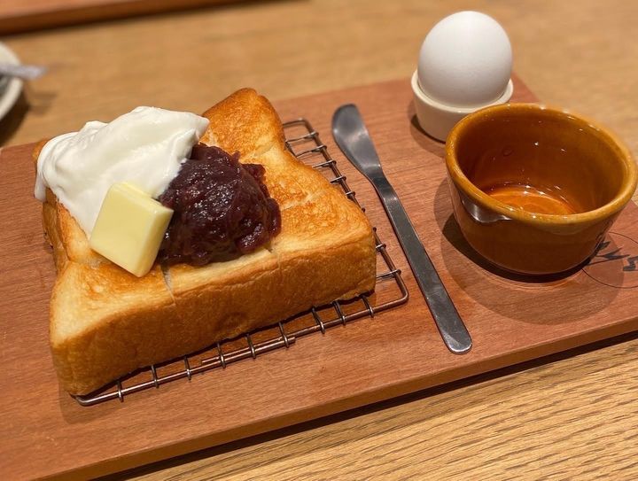 こんがり焼き色が付いた、見た目も美しいトーストに、たっぷりのあんことバター、さらには生クリームまでトッピングされています!