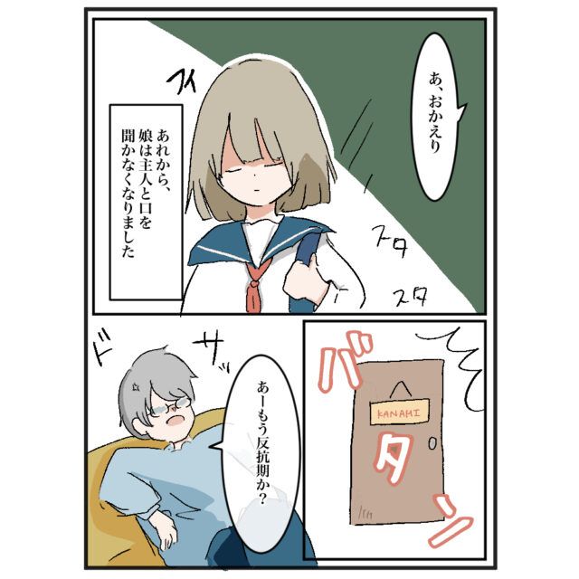 その後、「あ、おかえり」学校から帰って来た叶実ちゃんに声をかけるご主人、でも叶実ちゃんは一言も話さず部屋に入ってしまいました。その姿を見て「あー、もう反抗期か?」と呟くご主人。