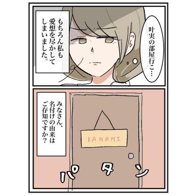 自分の名前が、父親と元カノとで決めた名前だと知って落ち込む娘の叶実ちゃん、ママのゆうかさんは叶実ちゃんを慰めた後、ご主人に「どうして元カノと決めたって話したの?」とたずねたところ、「何が悪いの?俺が一生懸命考えた名前にとやかく言われる筋合いはない」と言い放ったご主人。その言葉を聞いて「なんて無神経な・・この人に叶実の気持ちはわからない」と諦めに近い気持ちを持つように。当の本人は相変わらず事の重大さを認識していないようでした。